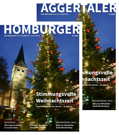 Unsere beiden Lokalmagazine Aggertaler und Homburger sind seit über 10 Jahren auf dem Markt und erfreuen sich bei den Menschen in unserer Region großer Beliebtheit. Diese beiden vierteljährlich erscheinenden Publikationen werden kostenlos an alle Haushalte in der Gemeinde Engelskirchen, im Raum Dieringhausen (Aggertaler) und in der Stadt Wiehl und der Gemeinde Nümbrecht (Homburger) verteilt und liegen zusätzlich an ausgewählten Verteilerstellen (u.a. Rathäuser, Banken, Sparkassen, Geschäften) aus.